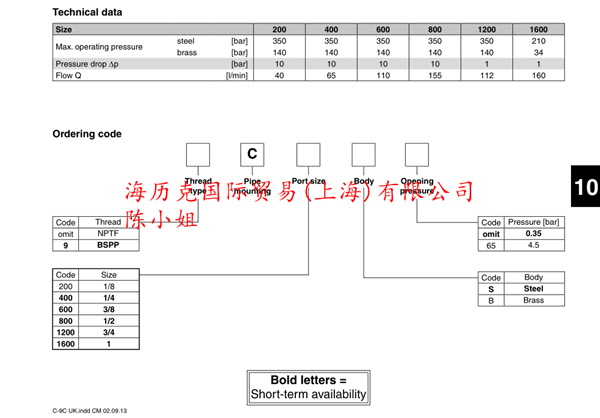 C系列單向閥的螺紋油口選項有ISO6149,NPT,BSPP,BSPT以及SAE。閥體材料選項包括黃銅、碳鋼及不銹鋼,其中碳鋼制、表面氧化處理的C系列單向閥為標(biāo)準(zhǔn)型式。9C1600S美國Parker派克單向閥海力克現(xiàn)貨訂貨資料